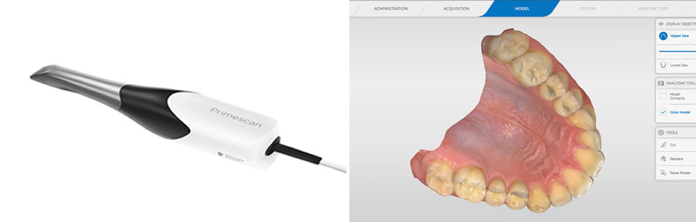 一方、当院で使用する「Primescan(プライムスキャン)」について、カメラでお口の中を撮影するだけで精密な歯型の3Dデータを採取することができるため、嘔吐反射が強い方でも快適な型取りが可能です。